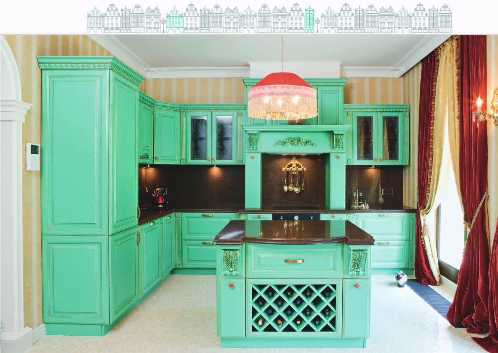 Угловая кухня Веста с порталом и островом превосходно демонстрирует новый дизайнерский стиль бохо шик. Возвышенная романтика, немного потертости и обязательные пышные аксессуары. При всем этом – высокая практичность и надежность элитной мебели из дерева