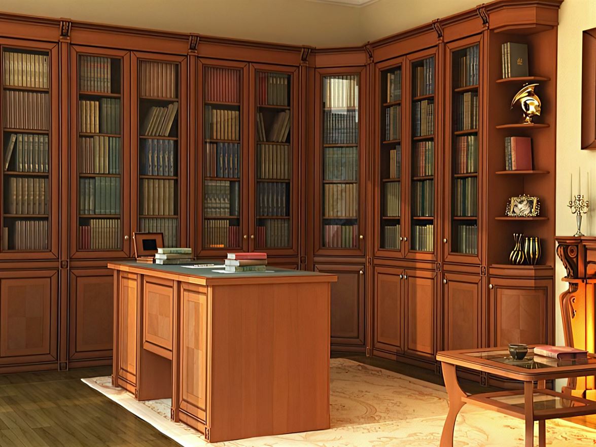 Изысканная мебель в классическом стиле для библиотеки «Акулина» выполнена в светлых оттенках с нанесением патины на отдельные элементы. Корпус эксклюзивной книжной мебели выполнен из массива дерева. Дверцы на фасадах остеклены и укомплектованы ручками из высококачественного материала. Одна из сторон углового гарнитура заканчивается открытыми радиусными полками. В комплекте с данной библиотекой рекомендуем приобрести письменный стол, выполненный в том же стиле.