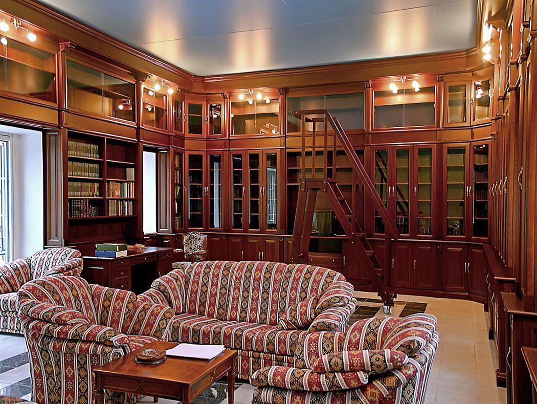 Данная модель библиотеки Белой выполнена из дерева цвета слоновой кости. Сам шкаф угловой, имеет четыре двойных и три одинарных секции. Модель изготовлена в стиле классики с красивой золотой окантовкой. Такую мебель можно использовать в дизайне частных библиотек. Дизайн проработан хорошо. При должном оформлении помещения может показаться, что вы посетили старинную императорскую библиотеку.