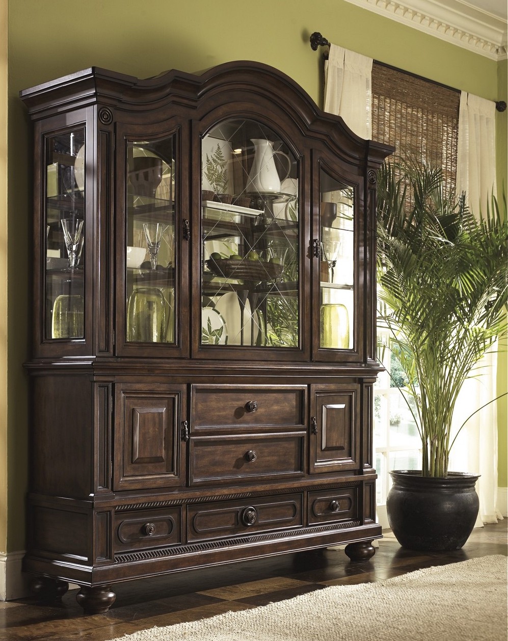 Элегантная гостиная Рауль выполнена из нескольких модулей, создающих привлекательную композицию. Крайние элементы с выступающим карнизом изготовлены из дерева со стеклянными вставками в виде небольших шкафов. Внутри установлена подсветка, несколько полочек. Это позволяет хранить ценные аксессуары из хрусталя, фарфора. В центральной части также имеются схожие модули. Над ними располагается открытая секция. Нижние элементы изготовлены с закрытыми фасадами. Вдоль стенок размещены небольшие шуфлядки для мелочей.