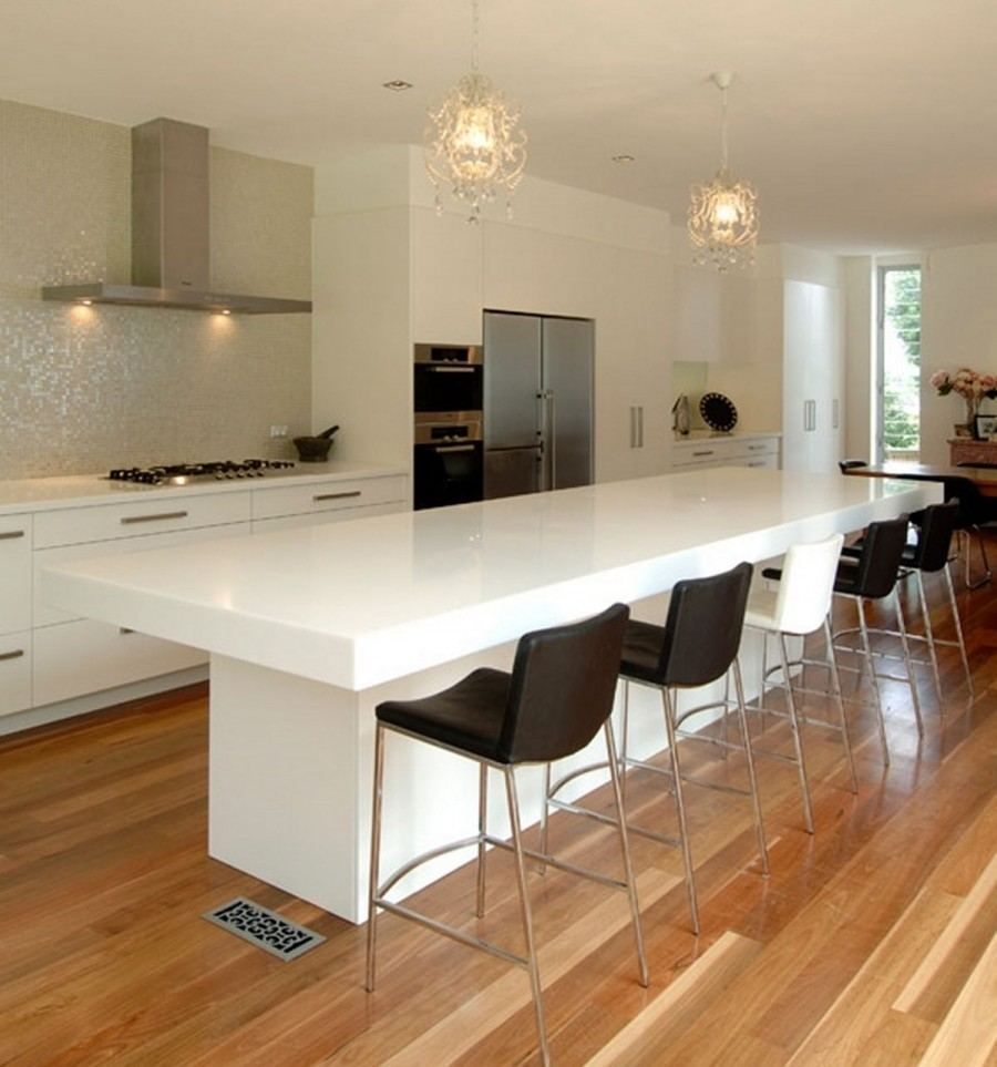 Прямая недорогая кухня без верхних шкафов выполнена из высококачественных плит МДФ. Белый цвет гарнитура, столешниц и большого стола, который можно изготовить на заказ дополнительно к основному комплекту, смотрится здесь вполне уместно и органично. Шкафы представлены полками, скрытыми за откидными глухими дверцами и выдвижными ящиками. Отсутствие декоративных элементов не делают эту кухню скучной и однообразной. Большая вытяжка, установленная над плитой, завершает композицию. Встроенная бытовая техника размещена в отдельном модуле, что способствует повышению функциональности.