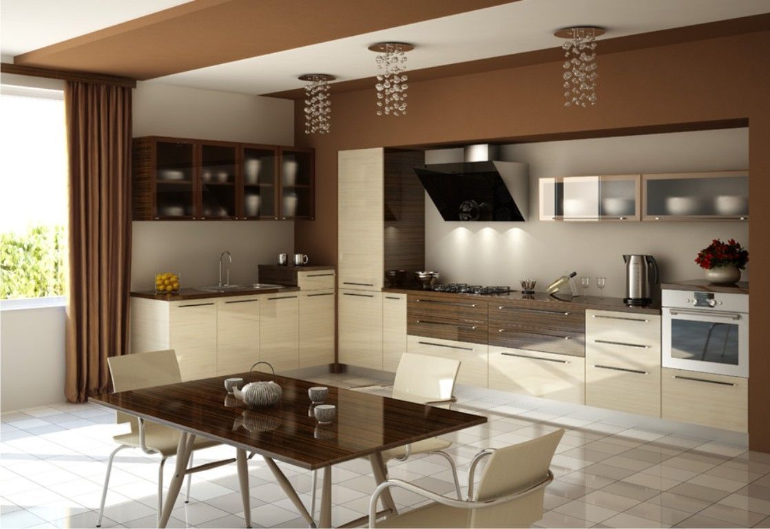 Бежевые и коричневые оттенки прямой кухни «Жан» отлично дополняют друг друга и создают прекрасную картину в современном стиле модерн. В интерьере имеется множество прелестных мелких деталей, превращающих «Жан» из простой кухни в ультрамодную и стильную. Стоит также обратить внимание на то, как гармонируют между собой предметы кухонного гарнитура. Коричневый стол и стулья кремового цвета станут превосходным дополнением к этой кухне. Основной материал мебели — МДФ, надежный, долговечный и устойчивый к влажности. Данная модель будет неповторимо смотреться в просторном современном коттедже.