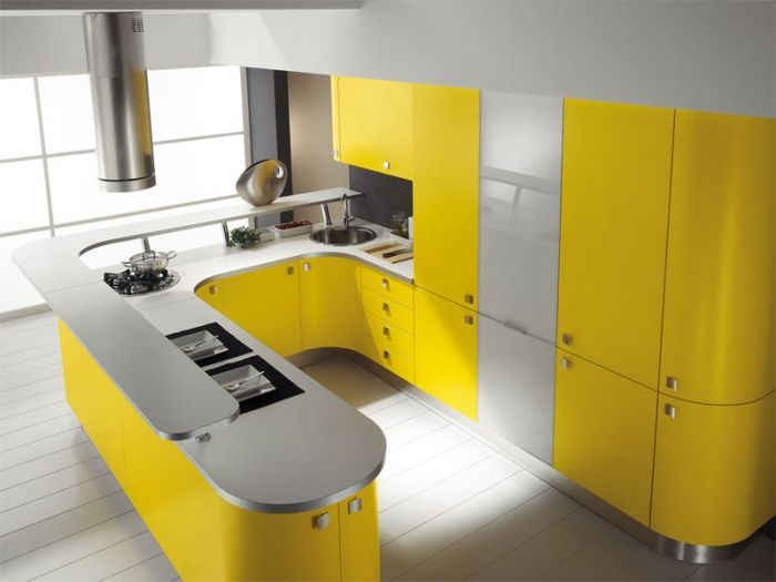 .Кухня «Иголия» в стиле хай-тек покорит сердца многих своей экзотичностью и оригинальностью. Она всегда будет выглядеть нарядно, создавая веселую и радостную обстановку. Все элементы ее дизайна необычны и стильны. Во-первых, это серая полка с закругленными углами, крепящаяся к столешнице. Во-вторых, прекрасно гармонирующая с остальным интерьером вытяжка того же оттенка, которой мы можем укомплектовать, если вы захотите. И завершат эту невероятную композицию полукруглые (радиусные) эмалированные фасады яркого желтого цвета. Угловая конфигурация с островом сэкономит много места и сможет вписаться даже в небольшую комнату.
