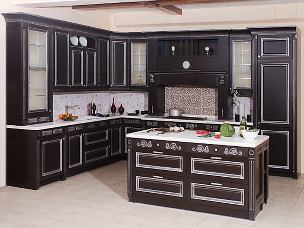 Любителям мебели темных оттенков непременно понравится эта классическая угловая кухня из массива. Впрочем, на заказ, по желанию клиента мы изготовим такую же модель другого цвета (на фото каталога – темно-коричневый). Кухонный гарнитур достаточно объемный, и для его установки нужно большое помещение. Фасады – прямые, некоторые дверцы верхних шкафов застекленные, есть открытые полки, на которых великолепно смотрится светлая фарфоровая посуда. Светлые столешницы освежают темные оттенки фасадов. Довольно большой остров представлен отдельно стоящей тумбой с дополнительными выдвижными ящиками для кухонной утвари.
