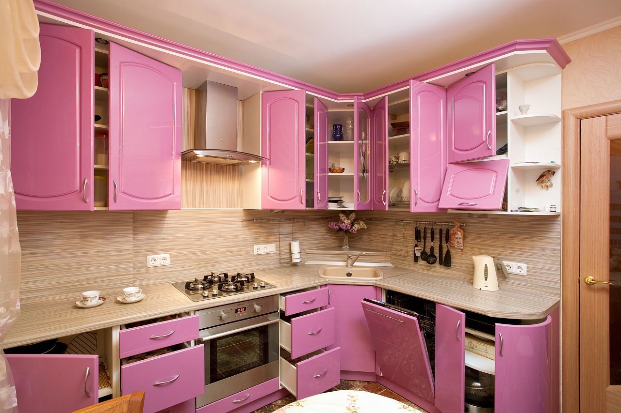 Угловая большая кухня в стиле модерн станет бесспорным украшением в просторной квартире или в загородном доме. На фото нашего каталога – модель в непривычном розовом цвете, но он не единственный из возможных, при оформлении заказа оттенок можно поменять на любой другой, этот вопрос мы всегда согласовываем с клиентом. Изменить можно и размеры, делается это для того, чтобы сделанная нами мебель идеально встала на свое место. Комплект состоит из шкафов с глухими дверцами с многочисленными полками и ящиками для кухонной утвари и посуды. Предусмотрено место для встроенной посудомоечной машины. С одной стороны внизу установлены радиусные фасады, вверху – открытые полки, на которые можно поставить комнатные растения, или задекорировать их по своему усмотрению.