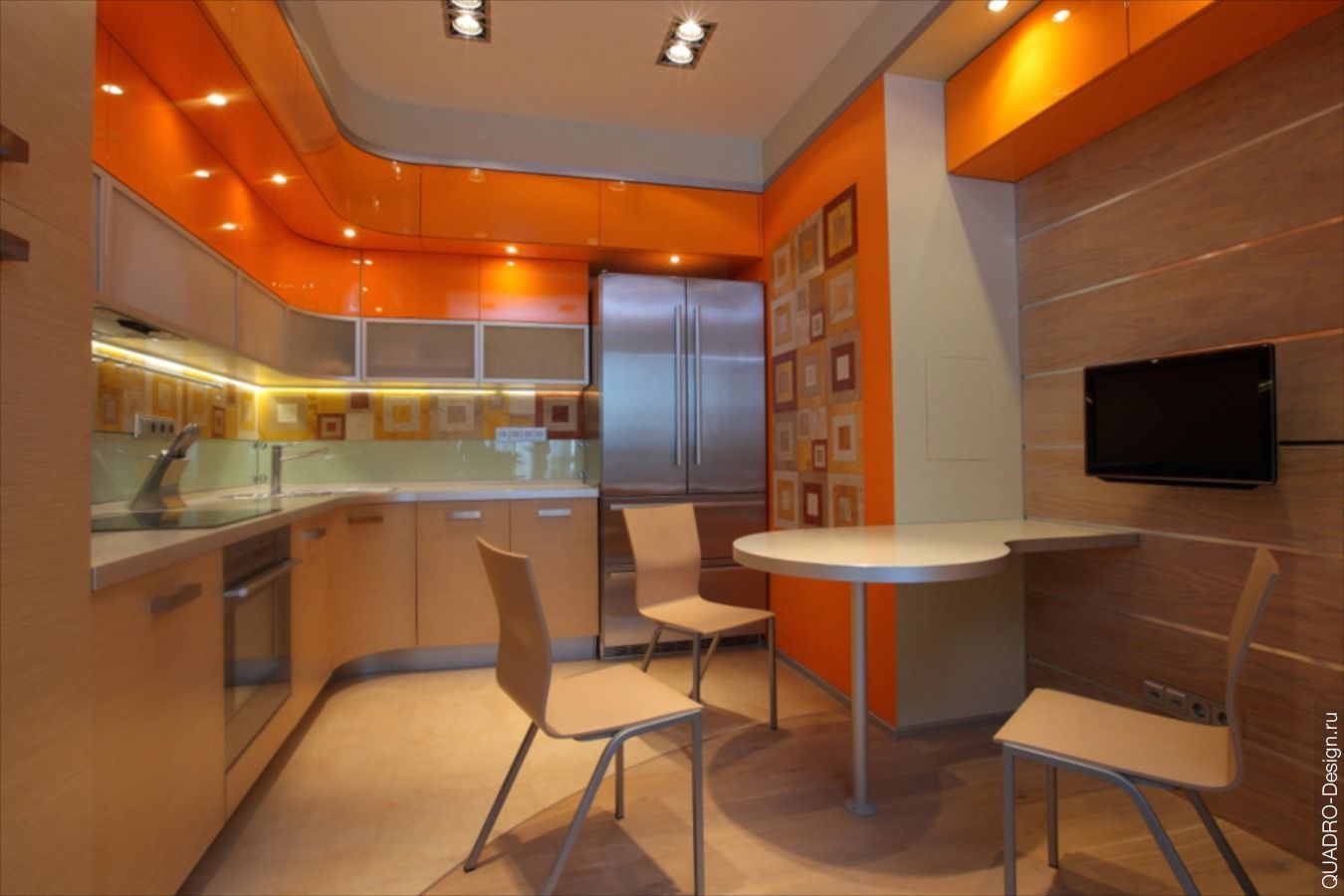 Эта модель имеет необычное расположение цветов и непривычную конструкцию верхней части гарнитура. Дизайнеры решили отойти от привычного сочетания «темный низ – светлый верх» и сделали наоборот. Нижние шкафы выполнены в светло-бежевом тоне, а верхние – в ярко-оранжевом. Угловой гарнитур «Карина» имеет однотипные витринные навесные шкафчики с горизонтальным открыванием, а над ними расположены более глубокие антресоли, создающие эффект выступа в потолке. В эти антресоли есть возможность установить врезные светильники. Благодаря глянцевой рельефности, кухня выглядит экстравагантно и современно, а благодаря большому размеру, она удобна и функциональна.