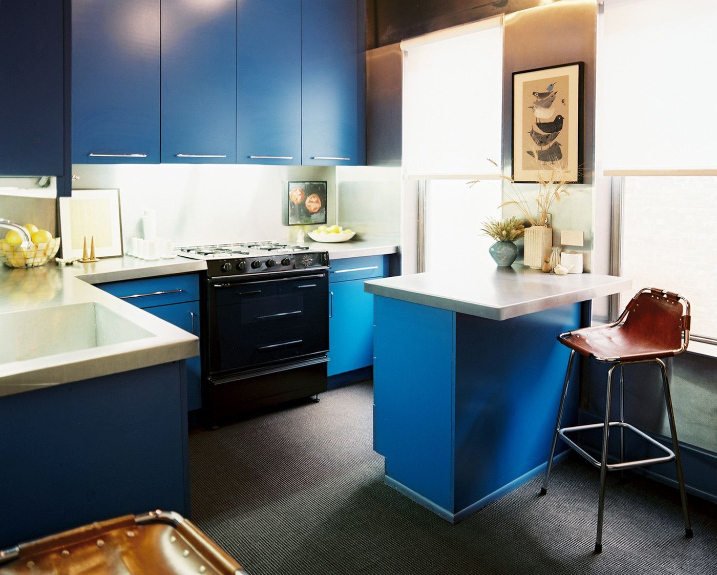 Синий цвет подходит только для светлых помещений. Но на своем месте он смотрится шикарно и стильно. Недорогая кухня Гюнтер – это интересное и оригинальное дизайнерское решение. Насыщенный матовый синий цвет фасадов и белая столешница из искусственного камня делают интерьер эффектным и смелым. Тип гарнитура – угловой с маленькой барной стойкой. Угол тоже является неполным: в одном крыле отсутствуют верхние шкафы. Все это задумано для того, чтобы кухня не смотрелась громоздкой и неуютной. Навесные шкафы гарнитура рациональны и практичны. Маленькая барная стойка будет удобным местом для перекусов, а при нехватке рабочей поверхности поможет хозяйке и в этом.