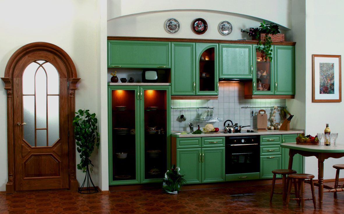 Небольшой набор кухонной мебели Бегония больше подходит для людей, не терпящих серости и обыденности. Ярко зеленый цвет поверхностей выглядит очень свежо и оригинально. Вместительные верхние модули оснащены подсветкой, удачно оттеняющей тонированные стекла фасада. Нижние шкафы имеют удобные выдвижные ящики, позволяющие наиболее рационально разместить столовые приборы и кухонную утварь. Необычайно привлекательный пенал станет ярким акцентом всего интерьера кухни. Прямое расположение модульной группы больше подходит для обустройства помещений в малогабаритной квартире.