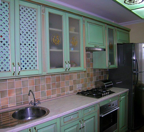 Набор кухонной мебели Асер изготовлен из массива, имеющего нежно-изумрудную матовую поверхность. Прямолинейная конфигурация предметов мебели подходит для обустройства различных по площади помещений. Декоративный фасад гарнитура оформлен в классическом стиле. Оригинальные верхние шкафчики украшают красивые матовые стекла с интересным рисунком. Столешница производится из искусственного камня, имитирующего текстуру натурального мрамора. В рабочую поверхность встроена удобная мойка. Нижние модули кухонного набора оснащены удобными выдвижными ящиками для хранения столовых и кухонных приборов.