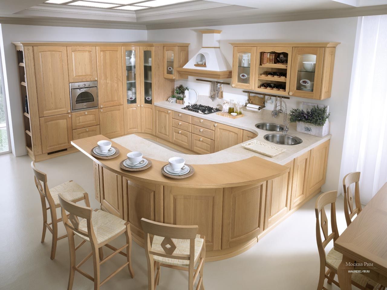 Деревянная кухня в доме – это гарантия качества и долговечности, это уютное и теплое место для семейных встреч, это показатель хорошего вкуса хозяев, это экологически чистая мебель, это классика, не выходящая из моды никогда. А гарнитур Бристоль со своими шикарными размерами и необычной формы – это просто мечта любой хозяйки. Большое количество высоких пеналов позволит без проблем разместить всю кухонную утварь. Дизайнерской изюминкой является закругленная барная стойка с двойной столешницей. Витринные шкафы создают эффект легкости и подчеркивают классический стиль. Кухня Бристоль лучше всего подойдет для загородного дома или просторной квартиры-студии.