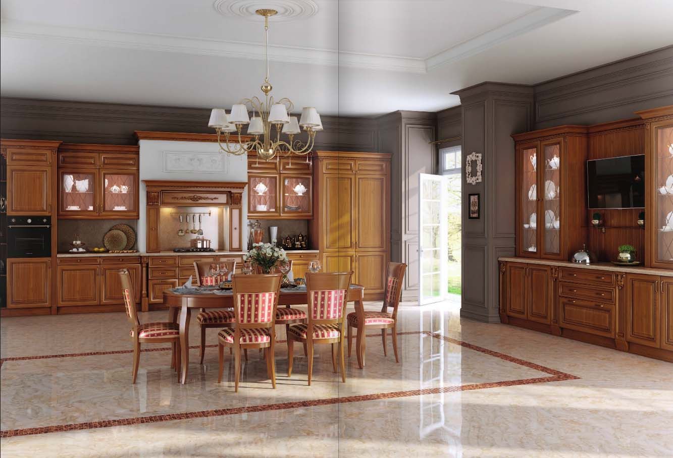 Прямая кухня из массива в стиле классика станет ценным приобретением, если для приготовления пищи отводится просторное помещение. Цвет – темный орех ( как на фото каталога) означает стабильность и приверженность традициям, это наша точка зрения, как производителя мебели. Но мы не настаиваем, и на заказ изготовим фасады любого оттенка – это совсем не сложно, цена при этом будет на прежнем уровне. Визуально можно выделить три части: ансамбль верхних шкафов для посуды с застекленными дверцами и нижних, для продуктов и кухонной утвари. В небольшом помещении он может стоять отдельно. В просторном – его дополняет узкий пенал и шкаф с рабочей столешницей и дополнительными местами для посуды и продуктов.