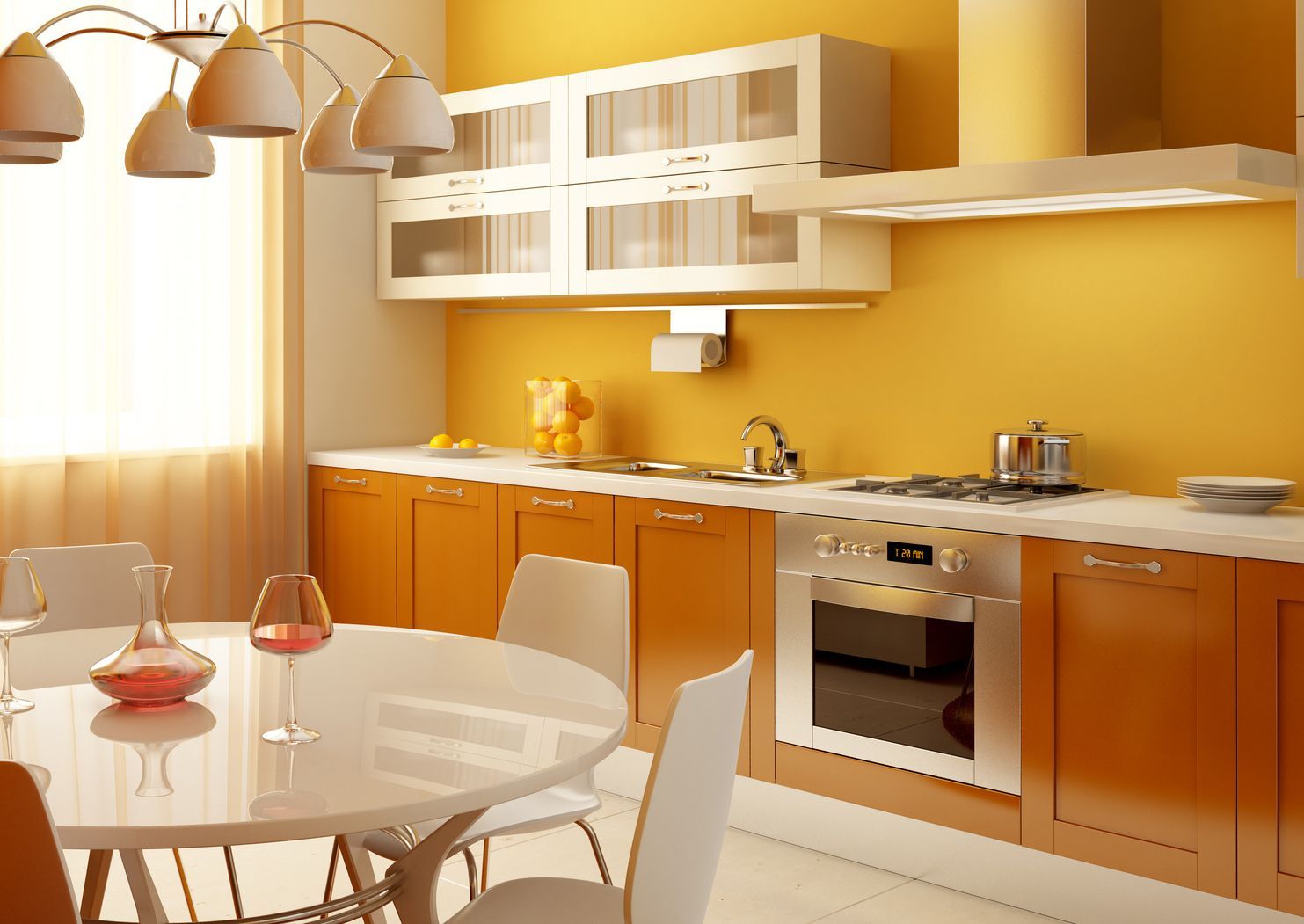 Маленькая прямая кухня из массива в стиле классического минимализма, где отсутствуют декоративные элементы, а бесспорным украшением можно назвать сочный оранжевый цвет нижней части гарнитура, «впишется» в небольшую площадь. Белая столешница и небольшой навесной белый шкафчик с четырьмя полками, скрытыми за застекленными фасадами и объемная вытяжка над плитой делают образ лаконичным и законченным. Оранжевый и белый – не единственно доступные оттенки для этой модели. На заказ мы можем изготовить гарнитур практически любого оттенка, этот вопрос согласовывается с клиентом при оформлении заказа и никак не влияет на конечную цену готового изделия.