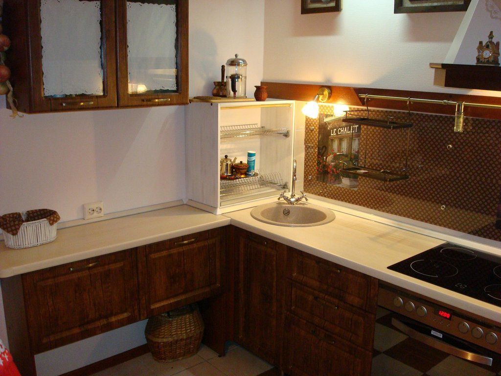Компактный и очень уютный набор кухонной мебели Артиматика имеет угловую конфигурацию, наиболее подходящую для обустройства небольшой кухни. Корпус гарнитура выполнен из массива, обладающего ярко выраженной фактурой натурального каштана. Легкие нотки Прованса нашли свое отражение на отделке фасада. Колорит старинного французского стиля подчеркивают искусственно состаренная матовая поверхность, необычное оформление верхних модулей и простая по форме фурнитура. Удобно расположенная мойка для посуды и встроенная варочная поверхность позволяют хозяйке чувствовать себя на кухне легко и спокойно.