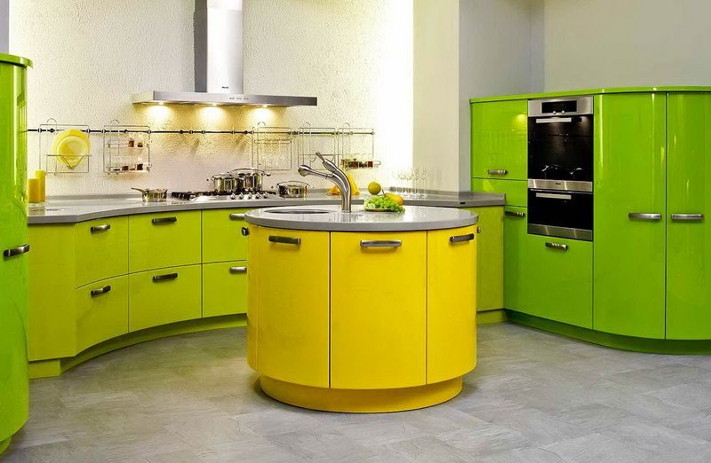 Экстравагантная недорогая кухня Банановый микс по индивидуальному проекту, понравится почитателям инновационных технологий и необычных дизайнерских фантазий, воплощенных в превосходной эмали и необычной цветовой гамме