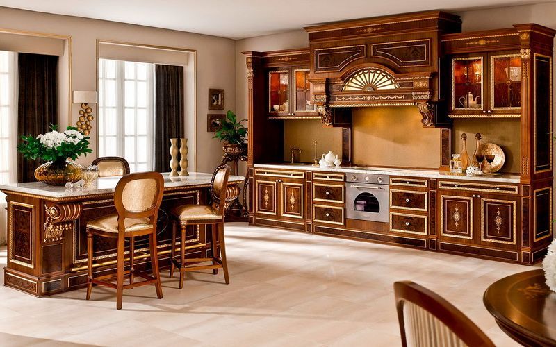 Как полагаете, это музейная дворцовая деревянная мебель или обычная современная кухня? На самом деле уникальная формула дорогого, но роскошного покрытия для массива помогла нам создать на заказ модель элитной кухни Бархат с оригинальным оттенком