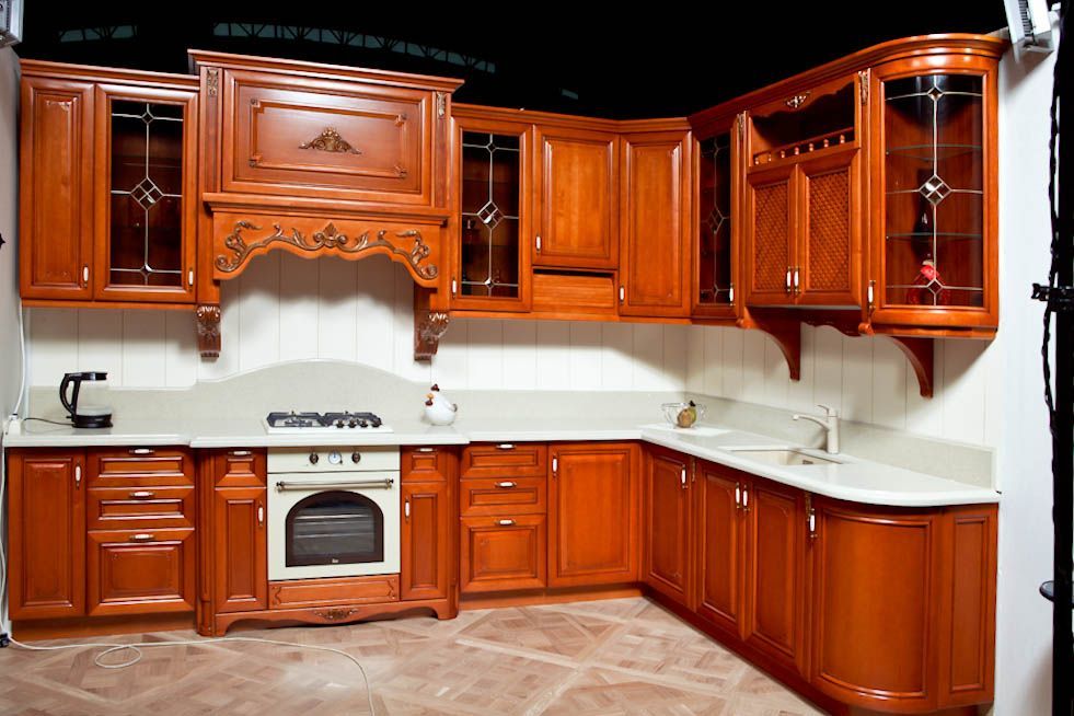 Угловая кухня Елена из массива бука – это абсолютно оригинальная гармония разумной цены, превосходной практичности и самого великолепного дизайна в классическом стиле. Стеклянные вставки в серебристых рамках, радиусные фасады, сияющие теплом природного материала, вычурный орнамент на портале для вытяжки, белоснежная столешница, превосходное рельефное декорирование каждой детали создают неповторимый образ нарядной пышности вашего дома. Эксклюзивная кухня на заказ для вашего дома от производителя – разумное решение, напишите нам прямо сейчас и мы украсим ваш дом неповторимым комфортом
