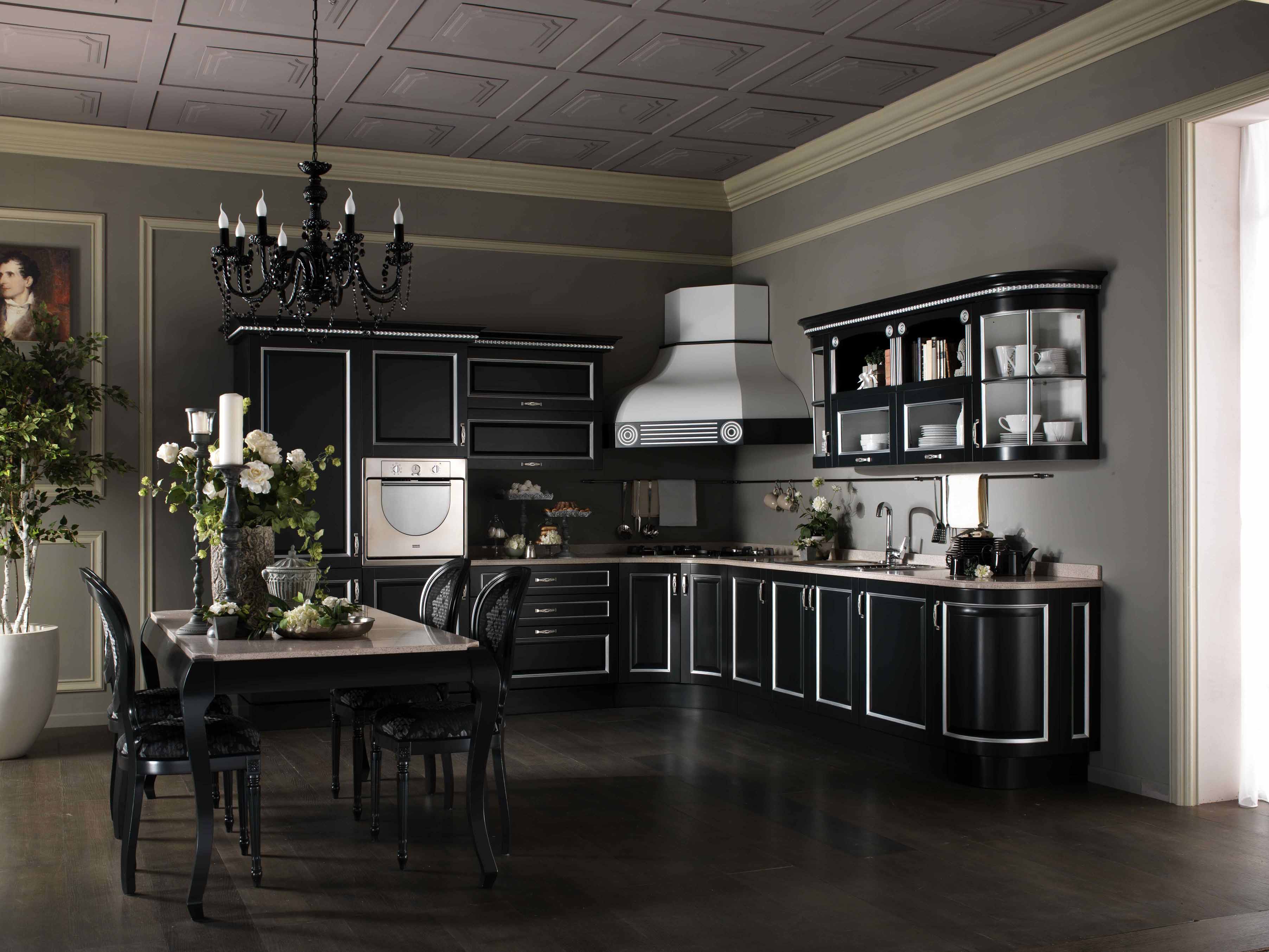 Угловая черная кухня Галактика сама по себе смотрится очень современно. Черно-белое оформление – классика интерьерного дизайна. Фасады из дуба, инкрустации серебристого металла, продуманные декоративные элементы. Но правильно подобранные аксессуары способны превратить интерьер в убранство готического замка. Апломб, честолюбие, нестандартное мышление и утонченный вкус – вот что подумают о владельце этого комплекта. Футуристическая Галактика прекрасно оформит кухню гостиную. Несмотря на преобладание черного цвета, набор очень яркий, приковывает взгляд своей необычностью, обладая при этом надежностью дубовой мебели и высокой функциональностью современной фурнитуры.
