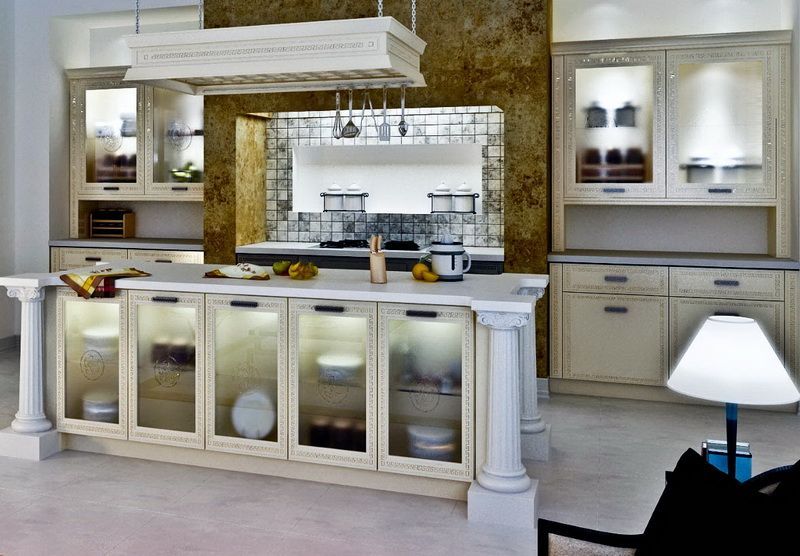 Невероятно красивый интерьер поможет создать роскошная жемчужная кухня Галатея на заказ, изготовленная из МДФ в незыблемом классическом стиле. Центром экспозиции является кухонный остров, столешница которого возлежит на четырех резных колоннах. Фасады гарнитура выполнены из филенок со стеклянными вставками. Все шкафы оснащены подсветкой, что создает особую игру света на рамках фасадов, украшенных узорами жемчужного перламутра. Мебель цвета слоновой кости отлично гармонирует с теплым оттенком искусственного камня, из которого сделана имитация камина, в котором расположена варочная плита. Классика – это всегда респектабельно и благородно. Элементы классики в гармонии с современными решениями образуют удивительный уголок изысканного уюта.