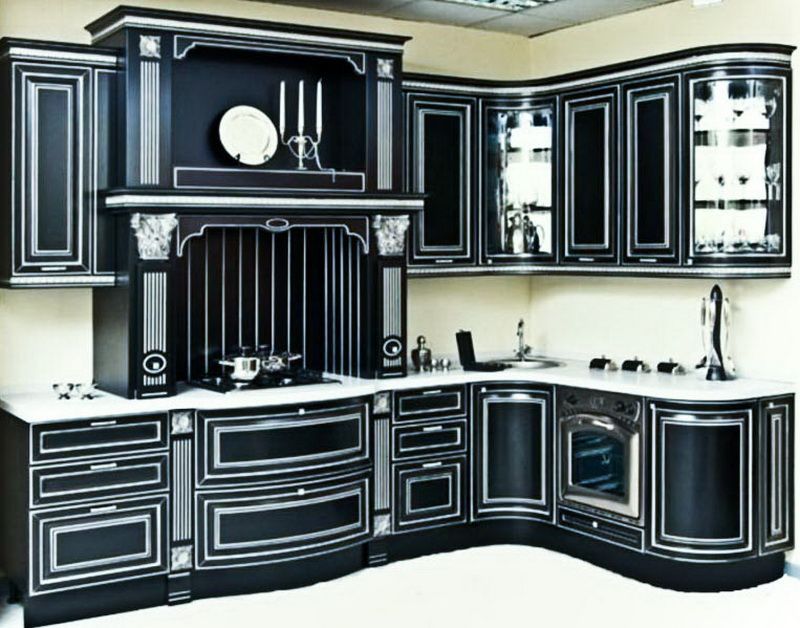 Роскошная угловая черная кухня Иоганн станет украшением помещения в таинственном готическом стиле. Величие форм и сочетание черного и белого цветов, предают помпезный вид творению дизайнеров. Радиусные фасады украшают многосоставные филенки и изящная фурнитура. Бытовая техника органично встроена в плавно изогнутые фасады. Варочная плита и портал для вытяжки стилизованы под старинный камин, украшенный резными пилястрами и витиеватой резьбой. Декором в такой кухне непременно станет различная металлическая посуда, напоминающая ту, которой пользовались в старинных замках во время пиршеств давней эпохи Возрождения.