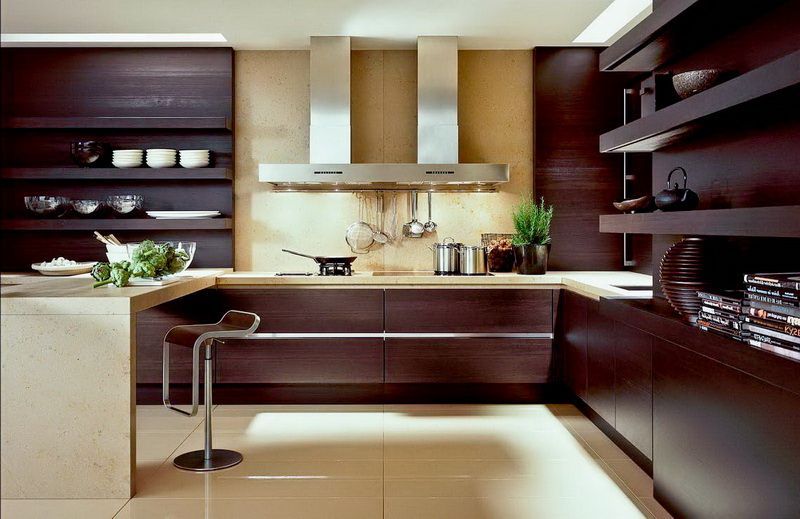 Невероятно стильно выглядит кухня Элизиум, созданная из высокотехнологичного и экологически безопасного МДФ, покрытого пленкой, передающей структуру и цвет вишневого дерева. Теплота и весомая уверенность в себе, четкость и структурированность жизни. Кухня не только вызывает эстетическое наслаждение, она еще неимоверно комфортна и рациональна. Насыщенный оттенок древесины создает благородное сочетание с бежевым цветом столешницы и барной стойки, декорированных под мрамор. Дорого и шикарно выглядит кухня в таком цветовом тандеме, что может рассказать о хорошем вкусе хозяев дома.