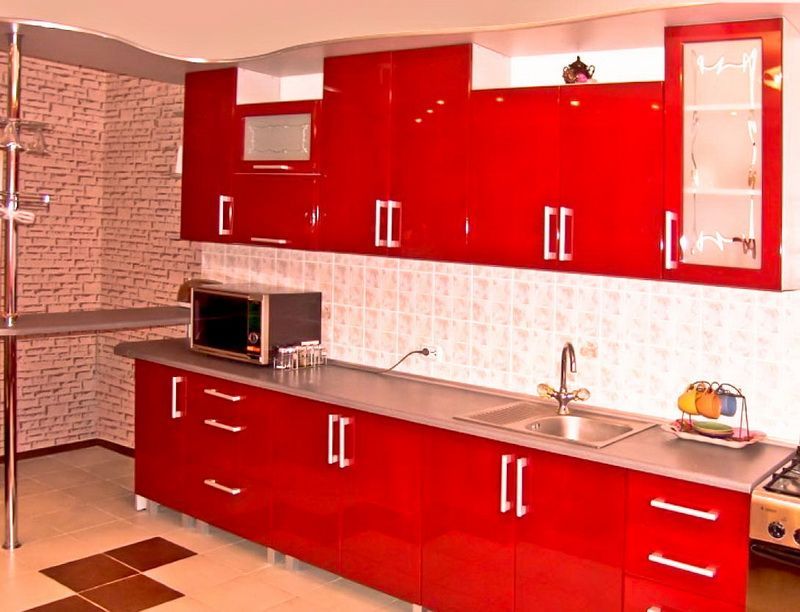 Почитателей новомодных веяний не оставит равнодушными удивительная кухня Коралл, созданная по индивидуальному проекту из высокопрочных материалов в современном стиле, проповедующем рациональность и практичность. Невероятно простые поверхности украшает массивная фурнитура контрастного цвета. Кроме обычных фасадов имеются дверцы с вставками из матового стекла, с причудливыми завитками, что служит декором мебельного гарнитура. Благодаря инновационным технологиям простая мебель необычайно функциональна. Обилие металлических элементов в дизайне кухни, подчеркивает идеальный блеск глянцевых фасадов, покрытых эмалью, напоминающих своим ярко-красным оттенком таинственные коралловые рифы.