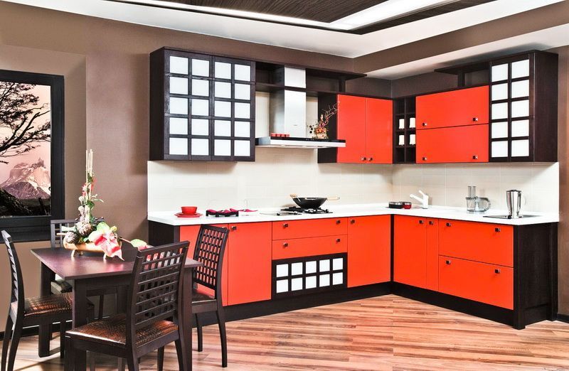 Создавая в доме интерьер с восточным колоритом, обратите внимание на компактную угловую кухню Лариса, созданную из высокопрочного МДФ. В последнее время оранжевые кухни стали невероятно популярными, благодаря тому, что солнечный свет помогает улучшить настроение и заряжает позитивом, избавляет от стресса, которому подвержены современные люди, живущие в бурлящем потоке повседневности. Очень благородно и аппетитно выглядит сочетание апельсинового и шоколадного цветов на белом фоне. Оранжево-коричневая кухня, созданная на заказ в стиле неоклассики, с легкими восточными нотками, выглядит неимоверно респектабельно и стильно.