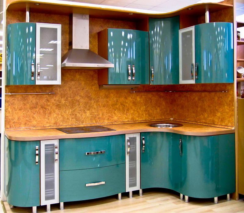 Мягкие волны сияющей бирюзы кухни Лесное озеро, изготовленной по новейшим технологиям из высококачественных материалов, приглянется обладателям малогабаритных квартир. Недорогая угловая кухня приглянется любой бережливой хозяйке