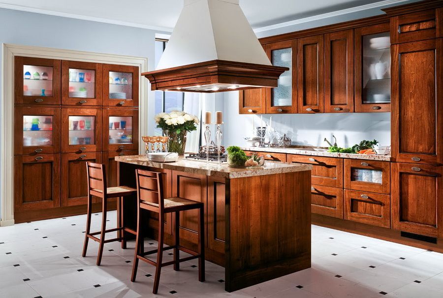 Мебель, составляющая кухню Монолит, очень проста и практична. Минимально обработанная древесина сохраняет свой природный узор, что немного разбавляет строгую атмосферу. Исключительно геометрические формы без лирических отступлений. Конструктивизм отличается продуманностью пространства, поэтому гарнитур составляет единую композицию в интерьере. Отдельные шкафы собраны в ровную стенку и при желании можно сделать на заказ любой комплект от производителя. Велика функциональная связь между конструкциями – замечательный и практичный кухонный остров, объемные шкафы, удобные стулья – все составляет единое целое.