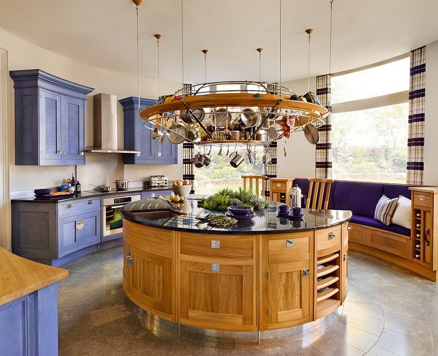 Уставшим от прямых углов и линий, понравится необычная кухня, разместившаяся в полукруглом эркере. Для изготовления мебели использовано дерево ясеня, сочетая фасады натуральной древесины и окрашенные. Стилистическим акцентом данного интерьера является кухонный остров необычной круглой формы с гнутыми фасадами. Над островом расположено интересное крепление для посуды, форма которого вносит футуристичные нотки в замысловатый дизайн. Мягкий уголок выдержан в том же стиле и чернильной цветовой гамме, что и гарнитур. Удивительная и комфортная кухня непременно порадует модным, функциональным и эргономичным дизайном.