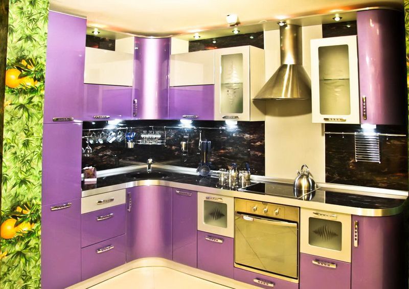 Замечательная угловая кухня Сиреневый букет из МДФ, очарует необычным цветовым решением и своеобразным дизайном. На заказ мы можем выполнить радиусные фасады для вашей кухни любых размеров и сложности