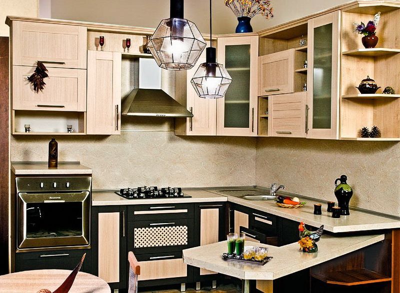 Очаровательная и удивительно изящная угловая кухня Сиринга, выполненная из высококачественного МДФ, покрытого пленкой, имитирующей натуральную древесину, удачно вольется в интерьер маленькой квартиры. Невероятно компактная, но очень функциональная мебель эргономична и рациональна. Удобная барная стойка выдвигается и складывается по мере надобности, что существенно экономит пространство. Фасады светлого цвета органично смотрятся с фасадами темного оттенка, имитируя благородный тандем светлого дерева и древесины венге. Элегантная и стильная кухня с легким оттенком кантри, станет излюбленным местом в вашем доме.
