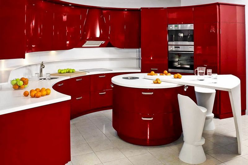 Необычная радиусная недорогая кухня Вишневая фантазия, изготовленная по индивидуальному проекту, подойдет как для маленькой квартиры, так и для просторного помещения. Геометрия фасадов позволяет максимально использовать пространство, по возможности срезая острые углы. Объемные шкафы и тумбы из высокопрочного пластика органично вмещают ультрасовременную бытовую технику, существенно облегчающую приготовление пищи. Насыщенный оттенок спелой вишни в сочетании с пенной белизной делают кухню невероятно элегантной и утонченной. Особенная форма стола и стульев, создает фантастическую атмосферу, в которую так приятно будет окунуться, душевно посидев за чашечкой чая с друзьями.