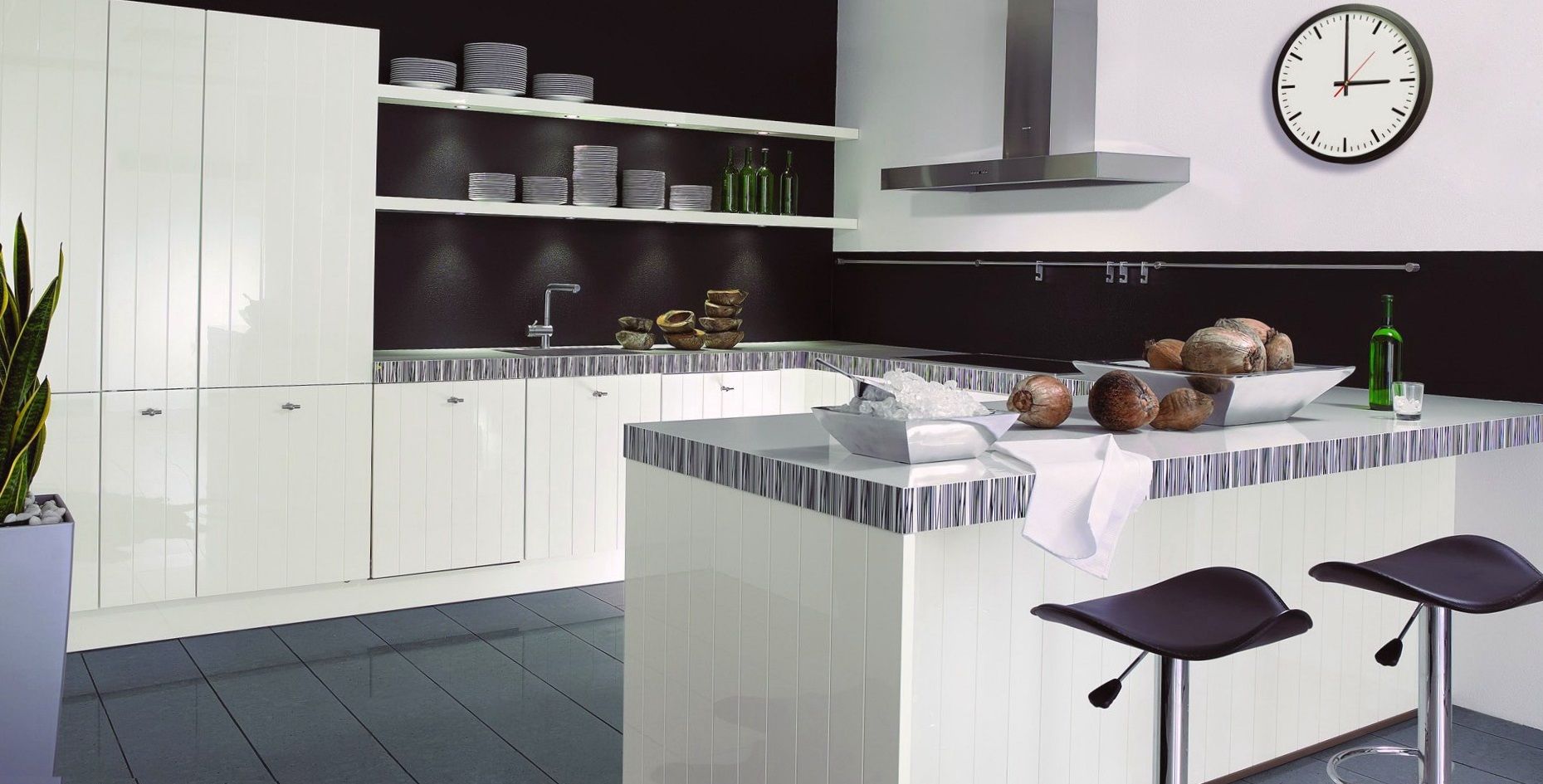 Направление модерн, выбранное для кухонной мебели Алана, позволило создать современный, стильный интерьер. Белые оттенки, присутствие толстой столешницы с вкраплениями чёрного цвета, металлических деталей, привлекающих благородным блеском – всё это радует взгляд.
