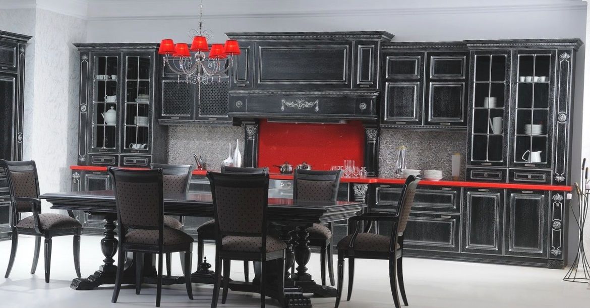 Кухня Грета – эксклюзивный экземпляр, впечатляющий стильным классическим направлением, совмещённым с современными элементами. Чёрный насыщенный оттенок мебели выглядит ещё изысканнее благодаря умело нанесённой серебряной патине. Также можно подобрать золотистый оттенок или же выбрать уникальную декоративную отделку. Всё это дополняется выразительной столешницей красного контрастного оттенка. Помимо яркого дизайна нужно отметить, что мебель состоит из разных модулей, где особое внимание отведено центральному со стеновым фартуком в тон столешницы. Благодаря этому декоративные резные детали, фасады разных форм, шуфлядки выглядят особенно привлекательно.