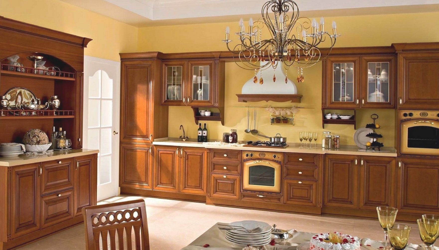 Кухня «Людовик» содержит в себе прекрасный классический стиль. Образовался он из-за слияния светло-жёлтых стен и коричневого дерева. Белое покрытие тумб и вытяжки, а также стеклянные вставки в шкафчиках, делают особый яркий акцент дизайна.