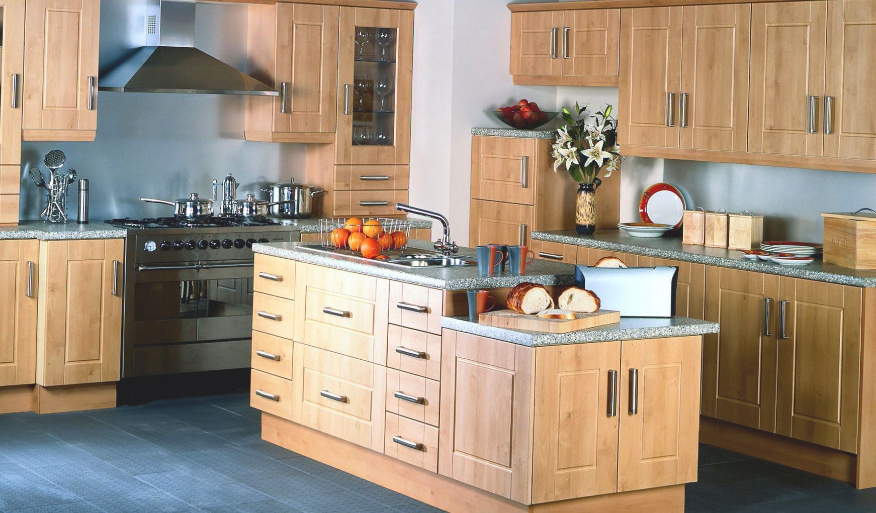 Кухня «Ностальгия» производится по индивидуальному заказу, чаще всего материалом для производства служит дерево светлой породы. Отличает эту кухню от всех остальных не только наличие современных декоративных элементов на фоне классического стиля, но еще и своеобразная простота, и строгость.