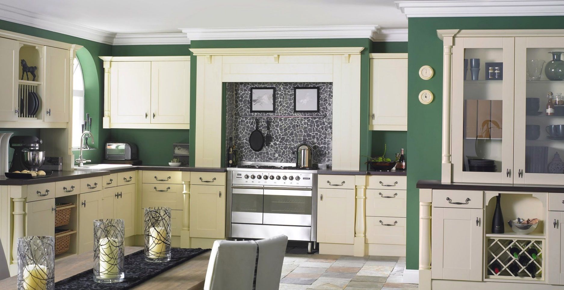 Светлая кухня Верона создана, чтобы освежать помещение, дарить ему необыкновенный уют. Отличительное преимущество в светлых оттенках, элегантных карнизах, декоративных элементах. Особого внимания достойны и точёные колонны, которые устанавливаются не только по краям модулей, делая их более выразительными, но присутствуют и в центральной секции, выгодно выделяя её. Среди нижних шкафчиков присутствуют закрытые тумбочки, имеются открытые полочки. Нельзя не отметить и продуманное размещение небольшой бутылочницы. А также воздушный шкафчик со стеклянными полочками и дверками.