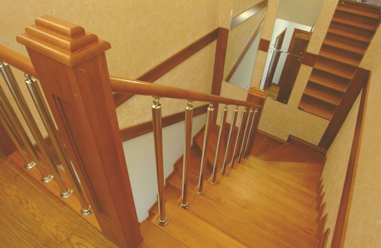 Лестница Прада станет в вашем доме настоящим украшением. Модель выполнена в стиле модерн, и это выражено в металлических элементах перил. Лестница поворотная, но ступеньки именно в этом промежутке выполнены оригинально – весь поворот состоит из 3-4 ступенек с широкой проступью к стенке. Основные столбики между секциями перил широкие и имеют декоративную отделку. В качестве декора на стенах прикреплены широкие планки из такого материала, что и выполнена сама лестница. Заказать лестницу Прада можно в студии Зеус.