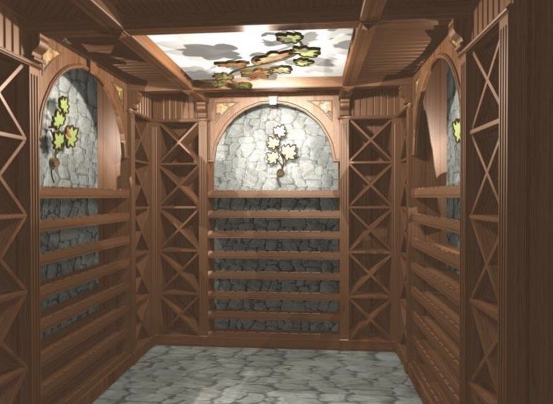 Роскошный погреб из массива, выполненный в стиле «классика» по достоинству оценит любитель и знаток вин. Впрочем, тут можно хранить и другие напитки. На фото каталога этот погреб цвета «орех», но на заказ можно его заменить любым другим оттенком, цена при этом существенно не поменяется. Мы, производители мебели, в этом вопросе ориентируемся на вкусы наших клиентов. В этой модели погреба предусмотрены полки с наклоном, и горизонтальные, разделенные крестообразными перегородками. И, конечно, есть куда поставить бутылки вина в вертикальном положении. Стеллажи образуют букву «П», и в центр комнаты можно поставить небольшой стол и стулья, чтобы можно было продегустировать напитки тут же.