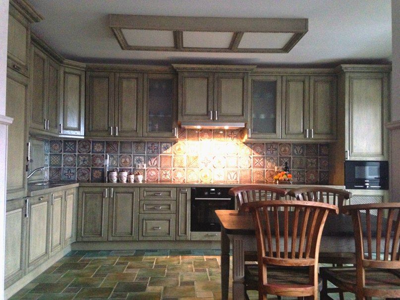 Разнообразие гаммы допускает присутствие всевозможных цветов, однако они должны быть спокойных оттенков, и недопустимо использование ярких тонов. Очень популярны тона мебели и помещения с наличием теплых оливковых, бежевых, кремовых, салатовых, коричневых и бордовых оттенков. Также кухня может быть выполнена в светлой, нейтральной или темной гамме с использованием соответствующих аксессуаров и предметов декора.