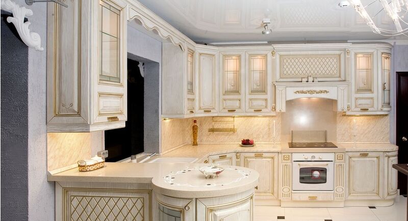 - Стены и потолки на кухне - пастельного теплого цвета, отделанные обоями или фактурной штукатуркой, имитирующими природные материалы: песок, тростник, гальку, известняк.