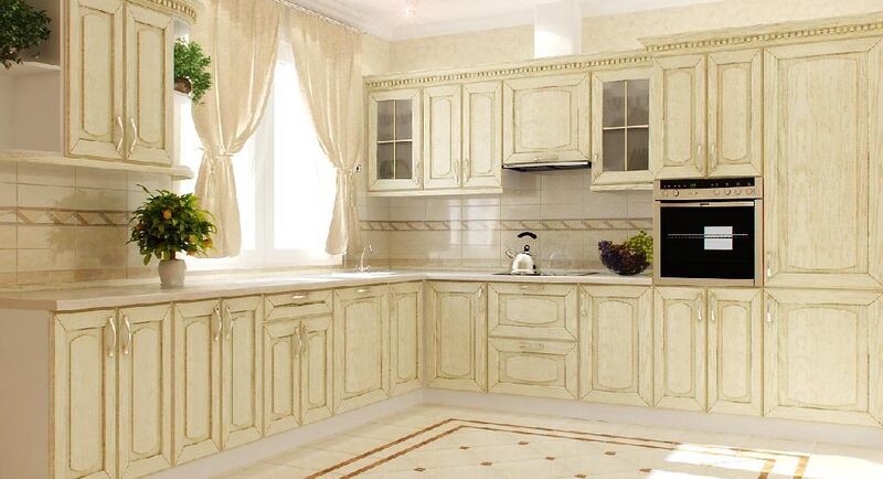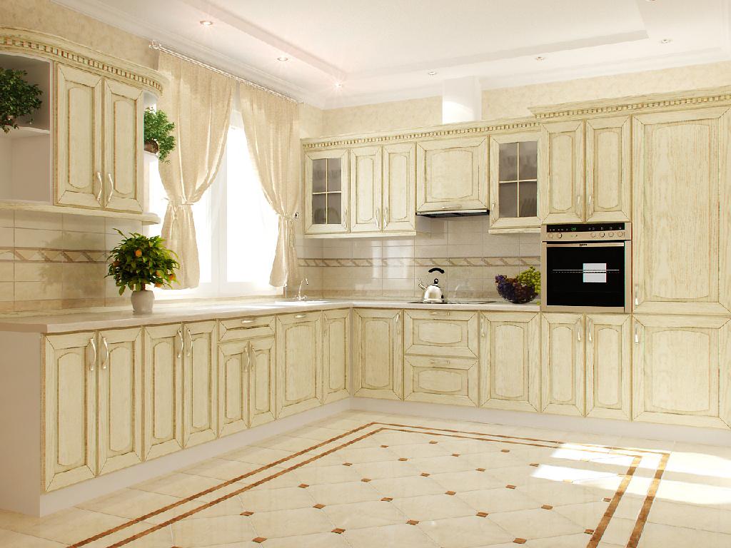 Например, мебельные фасады из дерева, деревянные стол и стулья с классическими формами, плюс декорирование занавесками с классическим рисунком. Остальные предметы и техника, выбранные в нейтральной цветовой гамме, прекрасно подчеркнут основной акцент.
