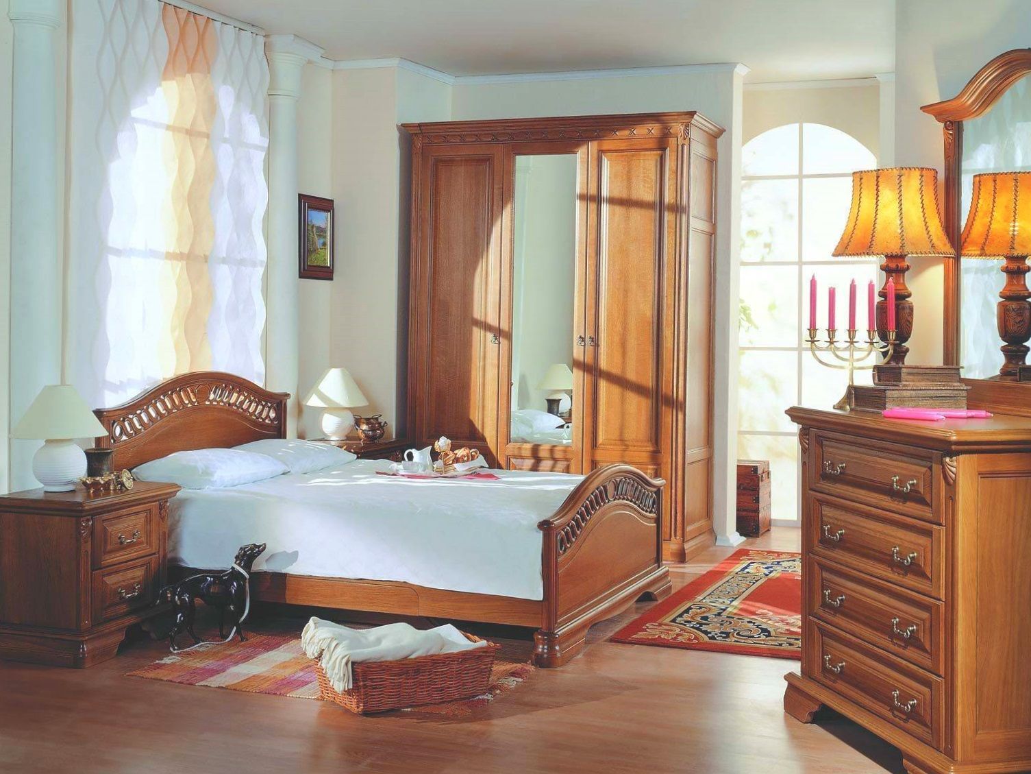 Изысканный деревянный шкаф Тимофей изготовлен из массива ясеня и воплощает традиции византийской классики. Резные узоры его фасадов создавались умелыми мастерами столярного ремесла, наполняя все элементы гарнитура теплом и оригинальностью. Индивидуальный подход к каждому заказчику позволяет подобрать идеально подходящий вашему помещению размер шкафа, и, по желанию, кровати и великолепного изящества тумбочек. Распашные дверцы шкафа достаточно вместительны, чтобы организовать хранение сезонных вещей. Большое зеркало в центре служит дополнительным элементом декора его внешнего вида.