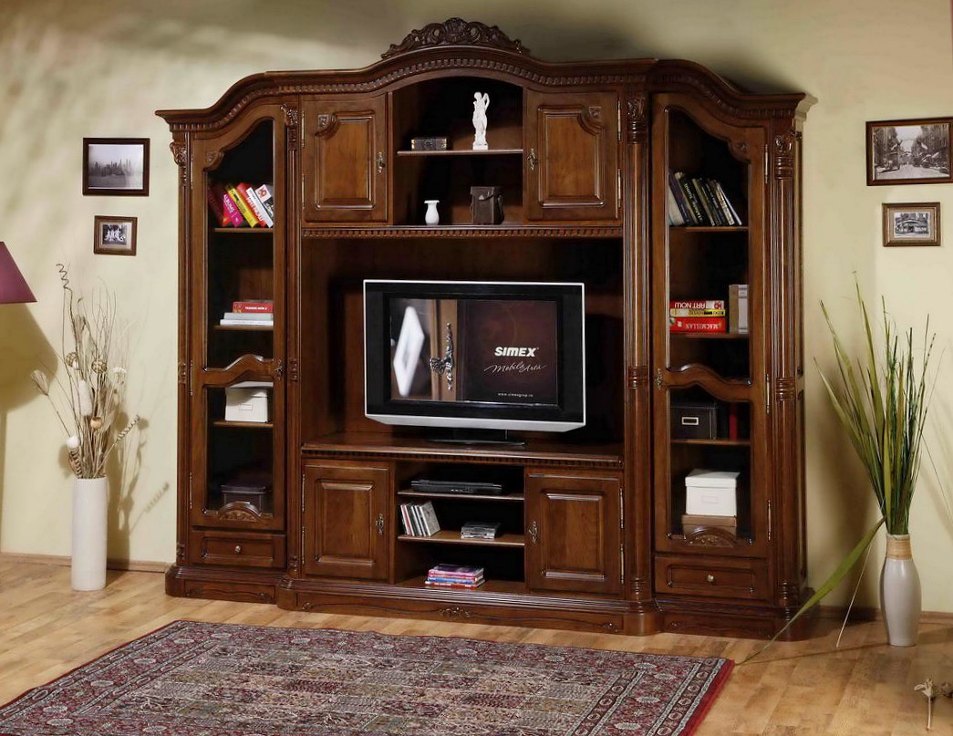 Великолепная стенка из массива в стиле современной классики станет украшением гостиной. Состоит нескольких шкафов разного назначения, среди которых есть и угловые. Один из них – для посуды или сувениров, он средней высоты с застеленной витриной. Более высокий узкий распашной угловой шкаф с зеркальной дверцей подойдет для одежды, к нему плотно примыкает тумба для ТВ и верхней открытой полкой. Завершает композицию еще один высокий распашной шкаф. На фото вы видите модель белого цвета, но клиент может выбрать любой понравившейся оттенок. При изготовлении на заказ производитель мебели может несколько изменить размеры стенки, для того, чтобы она хорошо «вписалась» в интерьер комнаты. Цена от этого не изменится.